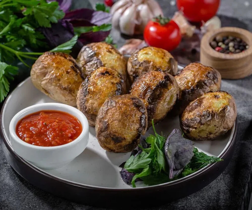 Отборный молодой картофель с домашним свиным салом, обжаренный на мангале.