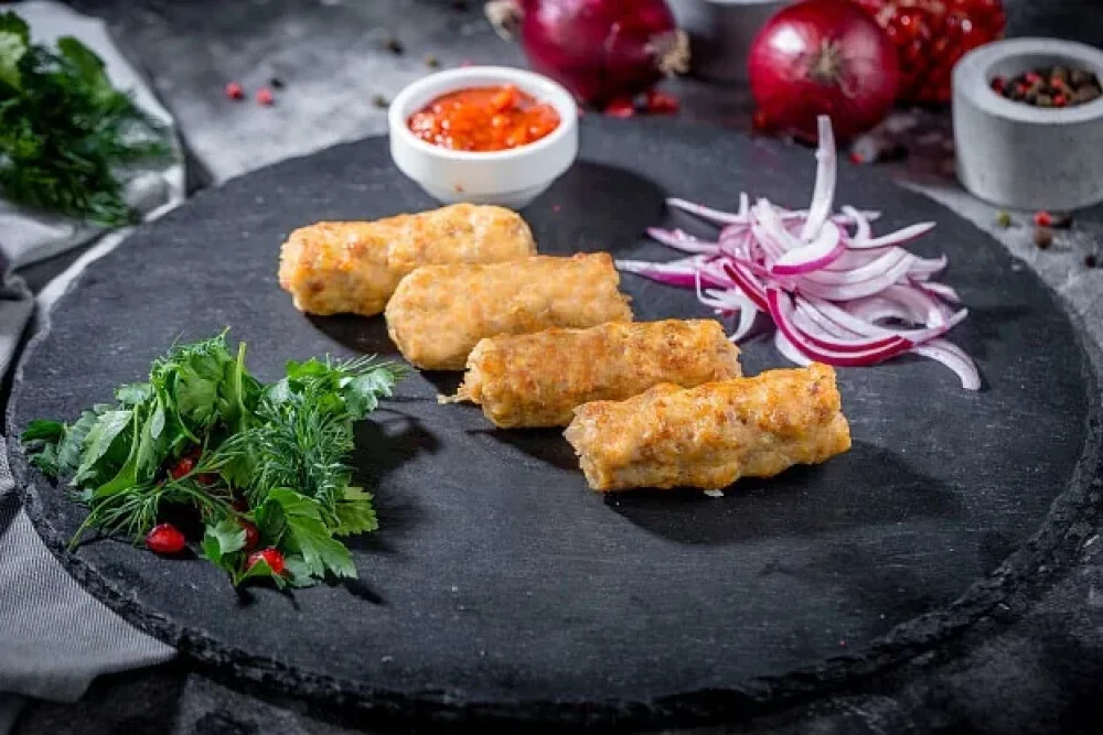 Люля-кебаб куриный готовится из отборного куриного бедра, которое тщательно обрабатывается, затем делается фарш со свежим луком, зеленью и специями.